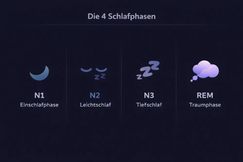 Dein Schlaf besteht aus vier verschiedenen Phasen, die sich während eines 90-minütigen Zyklus wiederholen. Jede Phase hat eine spezifische Funktion für deine Erholung und Gesundheit.